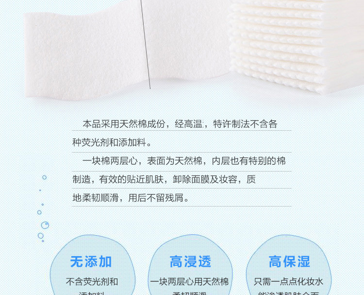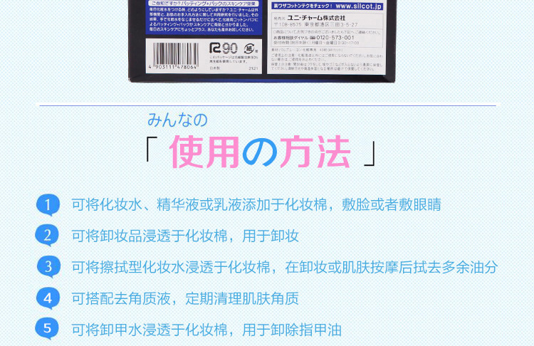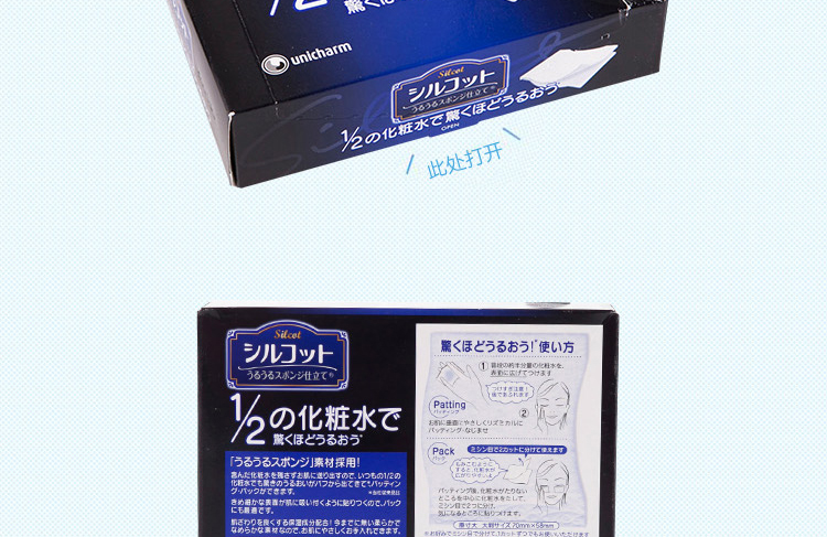 ●请不要用于化妆以外的用途。●不适合肌肤时,请停止使用。●本化妆棉用通常1/2量的化妆水就可以产生令人惊讶的润爽效果。●采用新开发的润滑海绵材料。●本化妆棉可以将化妆水完全送入肌肤,所以用通常1/2量的化妆水就可以从粉扑产生令人惊讶的润爽效果,能够用于轻拍皮肤、护肤。●极精细表面能够像黏在皮肤上一样贴紧肌肤,所以也推荐用于护肤。●而且配合了使肌肤触感变好的保湿成分。采用首创柔滑材料,能够呵护您的肌肤。【使用方法】●轻拍皮肤1.将大约通常一半量的化妆水在化妆棉表面展开。※注意不要使用过量化妆水。之后会溢出来。2.从与肌肤垂直方向轻柔地有节奏地轻拍皮肤使其渗入肌肤。●护肤轻拍皮肤后,以化妆水不足的地方为中心补充化妆水,沿打孔虚线将化妆棉一分为二,贴在担心的地方。※由于是2片1组,可以分开使用。进行揉搓会让化妆水更容易展开。※根据您的喜好,可以沿打孔虚线将化妆棉分开使用或一片一片地使用。