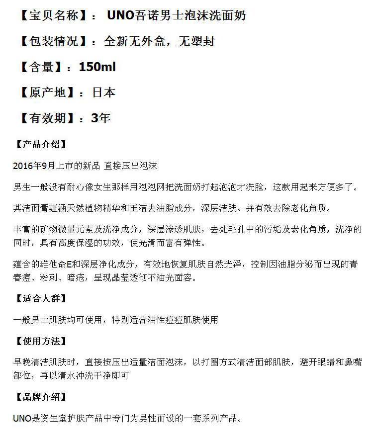 商品名称:日本资生堂UNO吾诺男士泡沫洗面奶 控油深层清洁