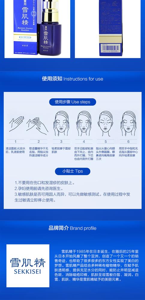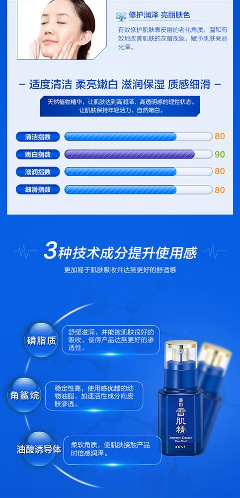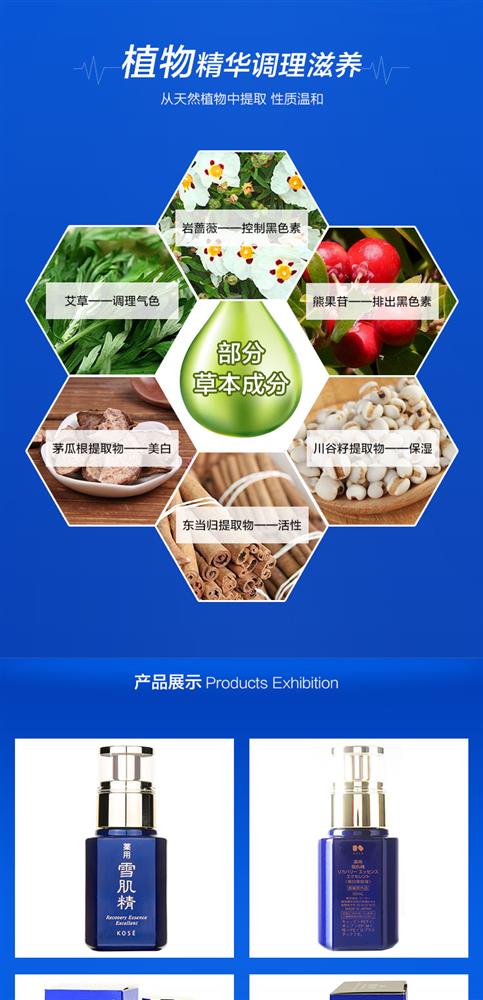 产品描述高丝雪肌精美白防护精华液50ml全面保护肌肤避免受到紫外线对肌肤所造成的各种侵害,保持肌肤白皙且洋溢着透明美感的日间用美白美容液。 防止黑斑和色斑的生成,以水润的使用感迅速地融合于肌肤,令肌肤白皙明丽。 含薏苡仁、当归、白蔹、旋覆花、牡丹皮等多种汉方植物提取液,特别值得骄傲的是—采用了具有卓越美白效果并且在雪肌精系列中初次登场的金银花提取液。具有优越的妆前隔离效果,添加水油分平衡均衡聚合物与多孔质粉粒,能在肌肤表面形成均一的化妆薄膜,因此也可以作为化妆基底或防晒品使用。